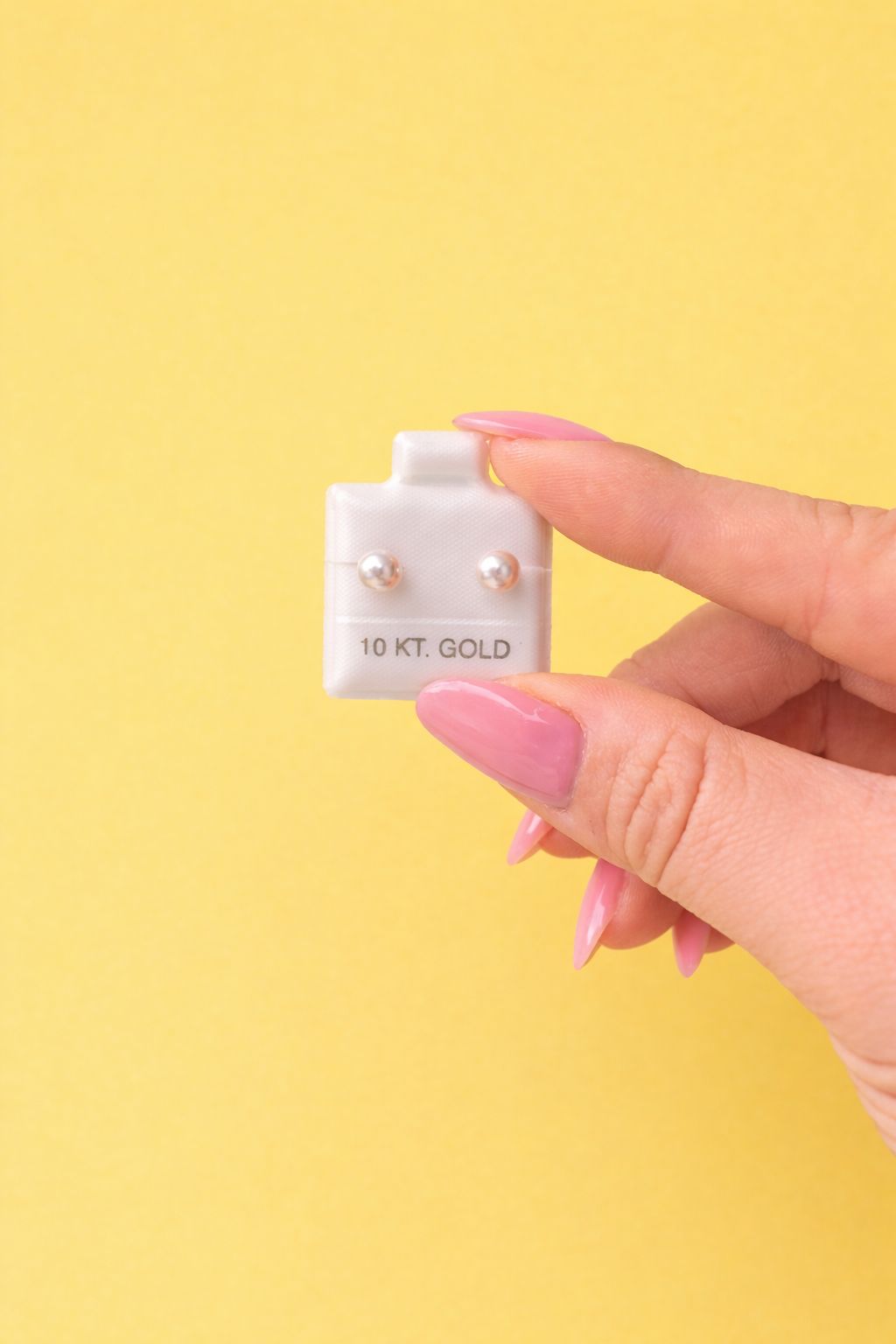 Aretes de Oro 10K con punta adecuada para perforar y bolita de seguridad.