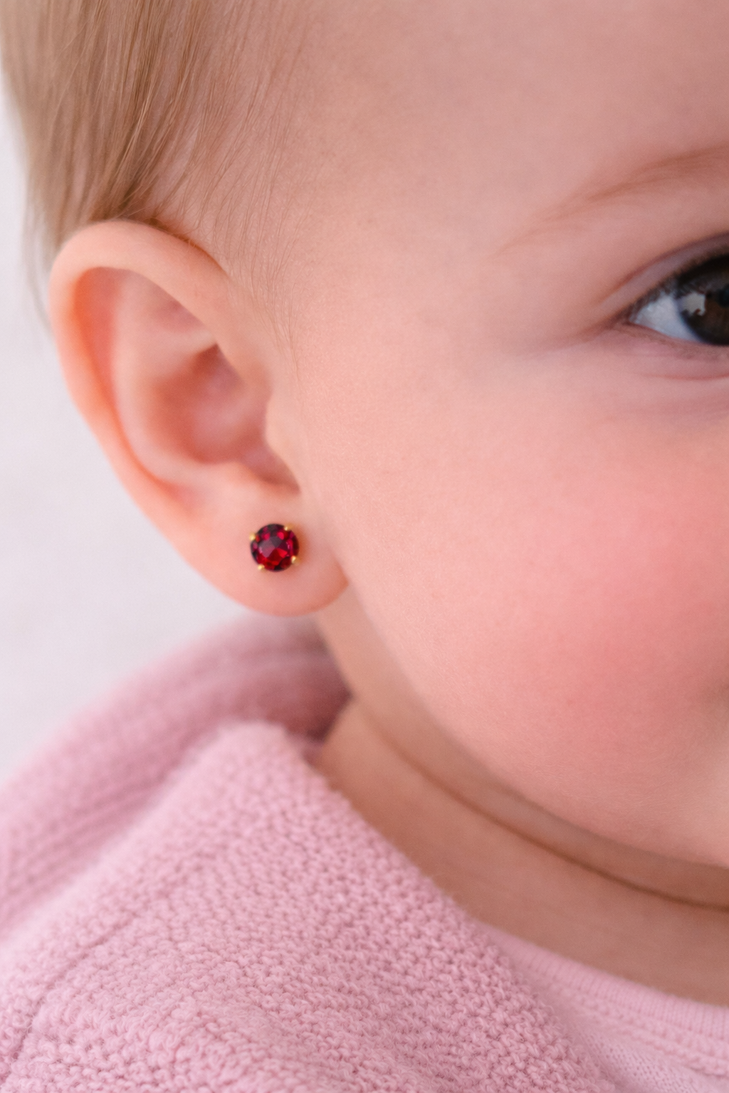 Aretes de oro 10K con punta adecuada para perforar y bolita de seguridad.